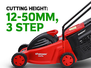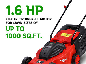 The Sharpex Electric Lawn Mower, featuring a 1.6 HP motor, is suitable for lawns ranging up to 1000 SQ.FT offering durable lawn care.