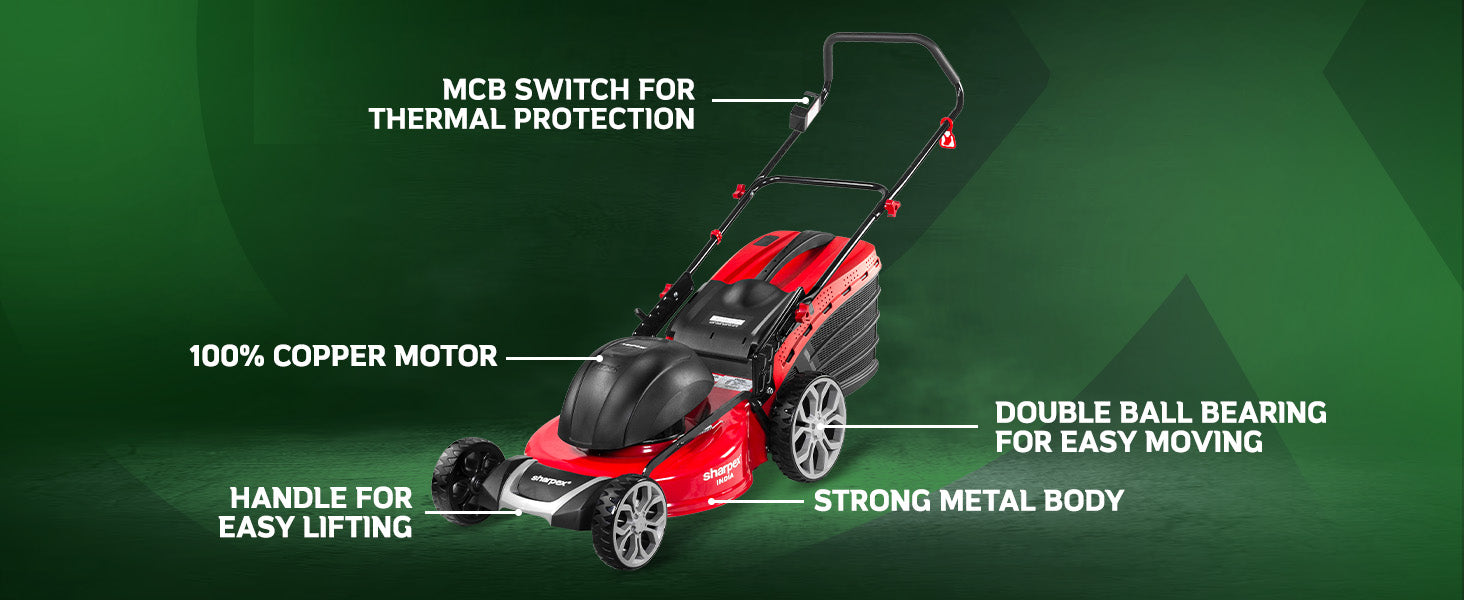 • Electric Lawn Mower with Grass Catcher is made with High Quality durable Material, Single phase 220 volt 2.5 HP electric motor, Razor sharp 16 Inch Steel Blades, with 45Liters Grass box.