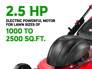 The Sharpex Electric Lawn Mower, featuring a 2.5 HP motor, is suitable for lawns ranging from 1000 to 2500 sq. ft., offering durable lawn care.