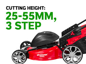 The cutting height is adjustable from 25mm to 55mm with three settings, allowing for precise trimming based on lawn needs.